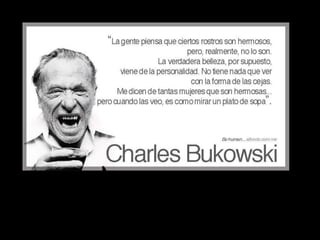 Este documento presenta extractos de entrevistas y obras del escritor estadounidense Charles Bukowski en los que contrasta su visión del arte, la creación literaria y el amor con perspectivas más convencionales. Bukowski defiende que un escritor debe dedicarse por completo a su trabajo y rechaza la idea de que existan "trabajos decentes". También expresa visiones cínicas sobre el amor y las relaciones humanas. Los extractos muestran su estilo irreverente y crítico hacia la sociedad.