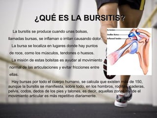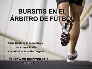 Este documento describe la bursitis, una inflamación de las bolsas sinoviales, en árbitros de fútbol. Explica que la bursitis ocurre cuando las bolsas se inflaman o irritan, causando dolor, y que es común en hombros, rodillas, caderas y otros lugares con movimiento repetitivo. Detalla las causas comunes como sobrecarga, trauma o artritis, así como los síntomas de dolor, hinchazón y rigidez. Finalmente, resume los tratamientos como crioterapia, movilización