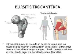 La bursitis trocantérea es una inflamación de la bolsa situada alrededor del trocánter mayor del fémur. Suele afectar a mujeres y personas de mediana edad o mayores y se asocia con factores como lesiones, actividad deportiva o cirugía previa de cadera. El diagnóstico se realiza mediante el examen físico y radiografías. El tratamiento incluye reposo, antiinflamatorios, hielo, calor, masajes, estiramientos e infiltraciones con corticoides.