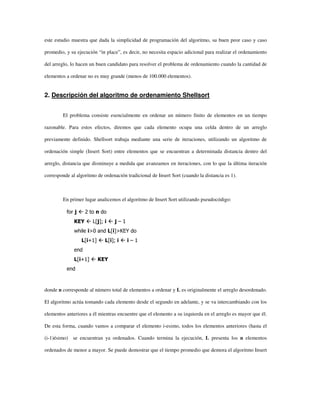 Este documento presenta un estudio sobre el algoritmo de ordenamiento Shellsort, analizando su desempeño con diferentes series de pasos e implementando optimizaciones. Los resultados muestran que las series de pasos dependientes del tamaño del arreglo superan a las series independientes, y que al restarle 1 al paso si es par se evita el peor caso y mejora la eficiencia. Shellsort es una buena opción para conjuntos de hasta 100.000 elementos debido a su simplicidad y rendimiento promedio.