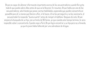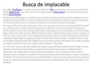 Bryan, un ex policía jubilado de la CIA, descubre que su hija Kim y su amiga Amanda han sido secuestradas en París. Bryan habla con uno de los secuestradores por teléfono y obtiene información sobre ellos antes de que corten la llamada. Bryan viaja entonces a París para rescatar a su hija, pero descubre con tristeza que Amanda ha fallecido por una sobredosis. Bryan logra encontrar y rescatar a su hija a tiempo.