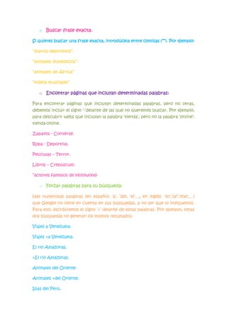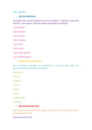 El documento ofrece diversas técnicas de búsqueda en Google, incluyendo el uso de comillas para frases exactas, signos negativos para excluir palabras y el uso de comodines como '*'. También se menciona cómo utilizar comandos como 'info:' para obtener información sobre un dominio y 'filetype:' para buscar tipos de documentos específicos. Además, se señala que no es necesario distinguir entre mayúsculas y minúsculas en las búsquedas.