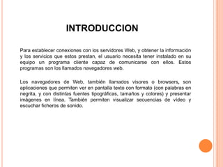 Los navegadores web permiten a los usuarios navegar e interactuar con contenido en internet. Los primeros navegadores incluyeron Mosaic y Netscape Navigator. Actualmente, los navegadores más populares son Internet Explorer, Firefox, Chrome, Safari y Opera. Los navegadores funcionan descargando páginas web de servidores y presentando el contenido, que puede incluir texto, imágenes, video y más, al usuario.