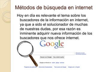 Este documento describe diferentes métodos y herramientas de búsqueda en Internet, incluyendo índices temáticos, motores de búsqueda, metabuscadores y operadores lógicos. Explica que los motores de búsqueda crean bases de datos rastreando páginas web con "robots" y almacenando las 100 primeras palabras de cada página junto con su dirección. Los metabuscadores como MetaCrawler realizan búsquedas simultáneas en múltiples motores para combinar resultados. Finalmente, señala que utilizar operadores