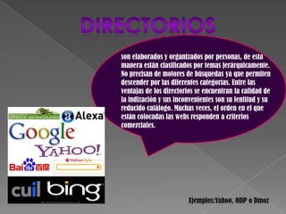 Los directorios son organizados jerárquicamente por temas manejados por personas, permitiendo descender por categorías sin necesidad de motores de búsqueda. Presentan una buena indización pero son lentos y tienen un catálogo reducido, con criterios comerciales influyendo el orden de las páginas.