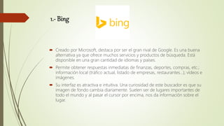 El documento describe seis motores de búsqueda principales: Bing, Yahoo Search, Baidu, WolframAlpha, Starpage y Ecosia. Bing es el principal competidor de Google y ofrece varios servicios complementarios. Yahoo Search es útil para preguntas extensas gracias a su integración con Yahoo Answer. Baidu es el motor más popular en China y ofrece mapas, foros y una enciclopedia. WolframAlpha muestra resultados directos en forma de datos en lugar de una lista de resultados. Starpage prioriza la privacidad al utilizar los resultados de Google sin almacenar datos person
