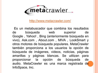 El documento describe varios metabuscadores y buscadores populares como MetaCrawler, Kartoo, Google, Yahoo, Searchmash, Ask, Powerset, A-9 y sus principales características. También menciona dos directorios: Terra, que ofrece correo electrónico y mensajería instantánea, y Messenger, un programa de mensajería instantánea descontinuado creado por Microsoft.
