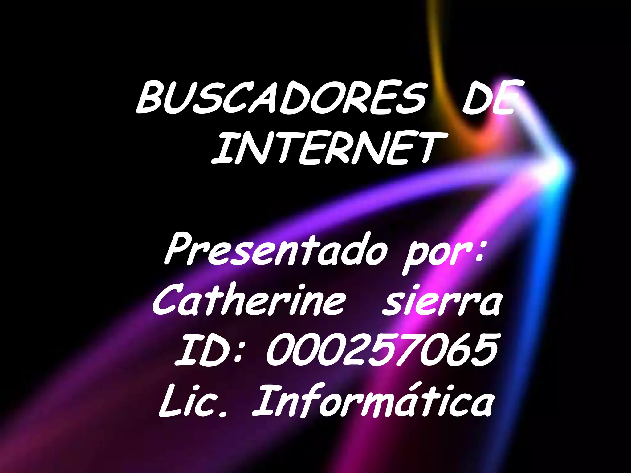Este documento describe los principales tipos de buscadores de Internet, incluyendo sus funciones, historia y ejemplos. Explica que un buscador es una página que permite realizar búsquedas en la web mediante palabras clave. Describe los tres tipos principales de buscadores - índices, motores de búsqueda y metabuscadores - y proporciona ejemplos como Yahoo, Google y Metacrawler. También resume brevemente la historia temprana de los buscadores y algunos buscadores importantes como Google, Yahoo, Microsoft y Noxtrum