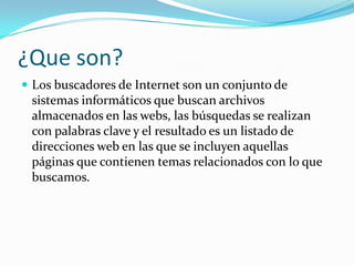El documento proporciona información sobre varios buscadores de Internet importantes como Google, Yahoo, Bing y YouTube. Explica que Google fue fundado en 1998 por Larry Page y Sergey Brin en la Universidad de Stanford y ahora es el buscador dominante. También describe otros buscadores tempranos como Yahoo, Lycos y AltaVista, así como buscadores actuales como Bing, Ask y YouTube.