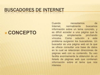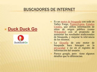 Los buscadores de internet son páginas web que ofrecen consultar una base de datos con direcciones de páginas web y su contenido. Algunos de los principales buscadores mencionados son Google, el más popular actualmente, Yahoo y DuckDuckGo, que enfatizan la privacidad del usuario. Otros buscadores históricos incluyen Lycos, Terra, AltaVista y Excite. Google Scholar es un buscador especializado en artículos académicos.