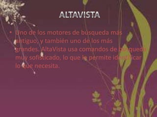 Este documento describe varios buscadores web, incluyendo sus características principales y fortalezas. Menciona buscadores como AltaVista, Bing, Cuil y Kngine, destacando que proveen diferentes tipos de resultados, filtros de búsqueda y tamaños de índices. También cubre buscadores especializados como Scirus y CiteSeer, enfocados en documentación científica y técnica.