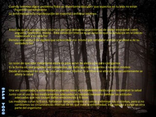 El documento explica que las enfermedades físicas son manifestaciones de conflictos internos y emocionales. Cuando una persona no vive de acuerdo a su verdadero ser y se desvía para complacer a otros, su armonía interna se altera y esto afecta su salud. Para restablecer la salud completa, se necesita no solo tratamiento médico sino también cambiar las actitudes y circunstancias internas que causan daño emocional. La curación total requiere sanar el cuerpo, las emociones y el espíritu.