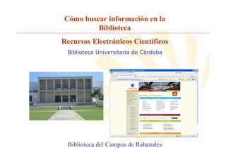 Este documento ofrece instrucciones sobre cómo buscar información científica en la biblioteca universitaria. Explica los diferentes recursos disponibles como bases de datos, catálogos, revistas electrónicas y libros electrónicos, y cómo acceder a ellos. También describe las herramientas para buscar dentro de estos recursos y resumir los resultados.