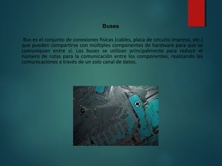El documento describe la historia y tipos de buses internos en computadoras. Explica que los buses permiten la comunicación entre componentes de hardware al compartir conexiones físicas. Describe buses paralelos e seriales y algunos buses históricos como ISA, MCA y EISA.