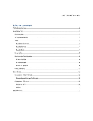 El documento describe los buses de datos en computadoras. Explica que un bus de datos transporta información entre componentes como la CPU, memoria, tarjetas de video y periféricos. Describe diferentes tipos de buses como de direcciones, control y datos. También explica conceptos como el northbridge, southbridge y cómo estos chips manejan la comunicación entre dispositivos a través de buses.