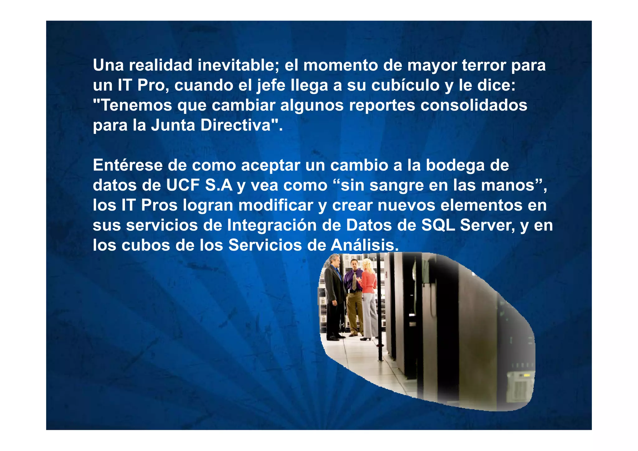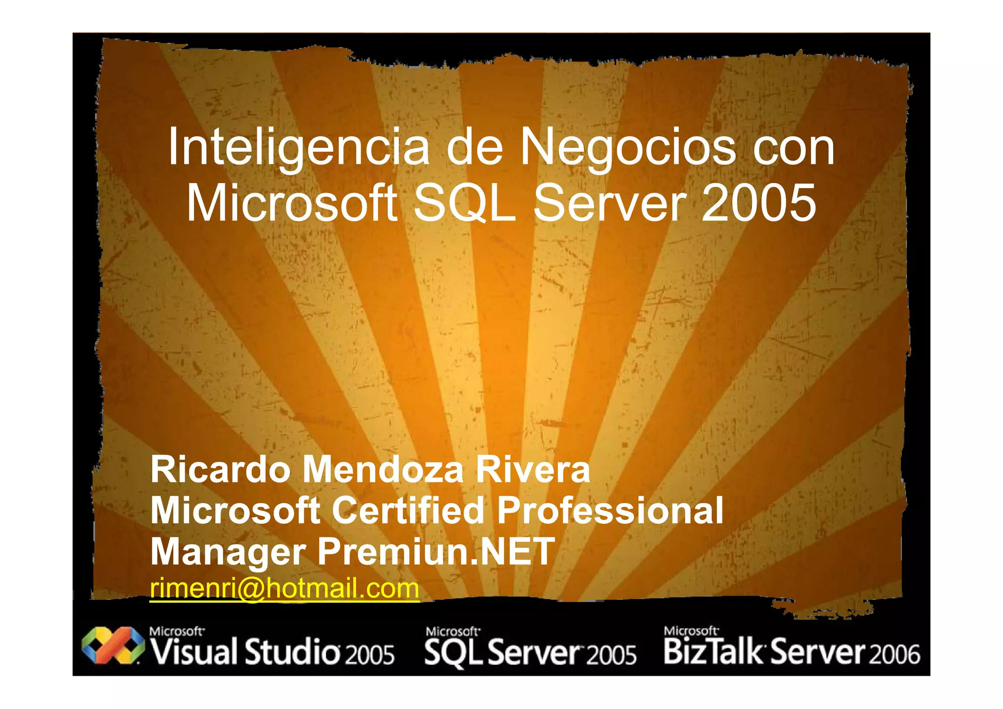 El documento habla sobre cómo los profesionales de TI pueden aceptar cambios a los almacenes de datos y modificar o crear nuevos elementos en los servicios de integración de datos y cubos de análisis de SQL Server 2005 de manera efectiva. Explica los componentes clave de la plataforma de inteligencia de negocios en SQL Server 2005, incluidos Integration Services, Analysis Services y Reporting Services.