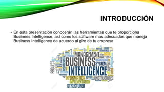 Este documento describe Business Intelligence (BI), que permite a las organizaciones acceder y analizar información en tiempo real para tomar mejores decisiones. Explica que BI incluye herramientas para crear informes e informes personalizados, realizar análisis estadísticos y pronósticos. También describe los componentes clave de un sistema BI y cómo empresas como supermercados y peluquerías han utilizado BI para mejorar sus operaciones y rentabilidad.