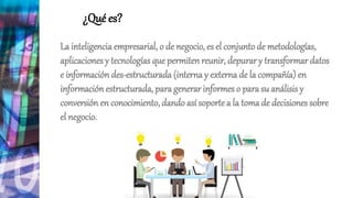 Este documento define la inteligencia empresarial como el conjunto de metodologías y tecnologías que permiten transformar datos en información estructurada para apoyar la toma de decisiones. Explica que la inteligencia empresarial ofrece beneficios como accesibilidad a la información, apoyo en la toma de decisiones y orientación al usuario final. También distingue datos, información y conocimiento, y describe brevemente el plan estratégico y las principales plataformas de inteligencia empresarial.