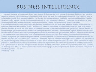 Este documento describe los sistemas de información hospitalarios y el enfoque de Business Intelligence. Explica que los sistemas de información tradicionales tienen limitaciones como poca flexibilidad y tiempos de respuesta lentos, mientras que los sistemas de BI pueden integrar datos de múltiples fuentes, proporcionar información adecuada a cada usuario y apoyar la toma de decisiones. También describe herramientas de BI como cuadros de mando, sistemas de soporte a decisiones y data warehouses para almacenar y analizar grandes volúmen