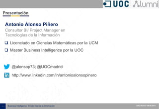 Este documento presenta una introducción a Business Intelligence (BI). Explica que BI es un conjunto de metodologías y herramientas para analizar datos y apoyar la toma de decisiones. Describe las necesidades de información de una organización, las definiciones y componentes clave de BI como el data warehouse y herramientas de análisis, y algunas tendencias en el uso de BI.