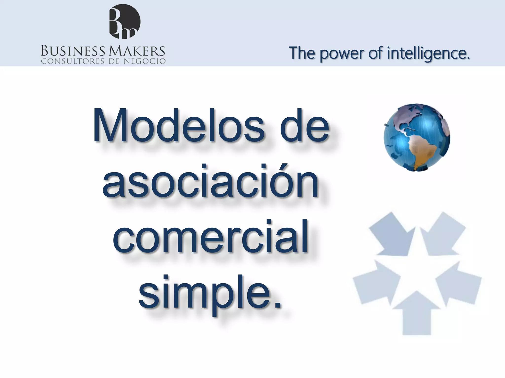 Este documento describe modelos de asociación comercial simple. Define los modelos y los describe como una guía para asociaciones entre pequeñas y medianas empresas. Presenta cinco modelos comunes con porcentajes de aportación para concepto, idea, operación y patente. Recomienda criterios como referencia, competencia, riesgo y necesidad para determinar los porcentajes de cada modelo.