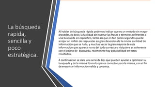 El documento ofrece consejos sobre cómo optimizar la búsqueda en internet mediante técnicas de búsqueda avanzada, destacando la importancia de una correcta ortografía y el uso de palabras clave. Se presenta una serie de operadores y herramientas para mejorar la efectividad de las búsquedas, como el uso de símbolos, filtros de fecha y búsqueda por voz o imágenes. En resumen, se busca guiar al usuario para que realice búsquedas más precisas y pertinentes.