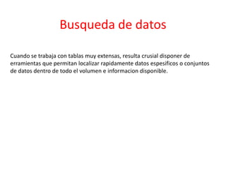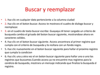 Este documento proporciona instrucciones sobre cómo buscar datos específicos dentro de una tabla grande en Access utilizando las herramientas de búsqueda y reemplazo, así como ordenar los datos de una tabla haciendo clic en el botón ascendente en la pestaña "Inicio".