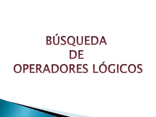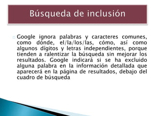 Este documento proporciona información sobre diferentes operadores y funciones de búsqueda en Google como excluir palabras, incluir comodines, limitar búsquedas a sitios web específicos, y buscar dentro de rangos numéricos. Explica cómo usar operadores como AND, OR y NOT para combinar o excluir términos de búsqueda. También describe símbolos especiales que pueden usarse para buscar grupos sanguíneos, páginas de Google+, etiquetas, frases relacionadas y más.