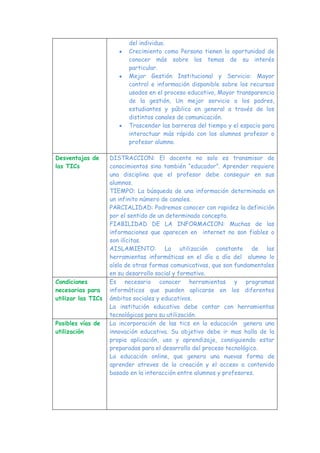 El documento describe las ventajas y desventajas de usar Tecnologías de la Información y Comunicación (TICs) en la educación. Las TICs pueden permitir una mejor comunicación entre estudiantes y maestros, mayor acceso a información, y aprendizaje colaborativo. Sin embargo, también pueden causar distracciones, pérdida de tiempo, y aislamiento social si no se usan de manera adecuada. Es importante que las escuelas tengan las herramientas tecnológicas necesarias y que los maestros estén