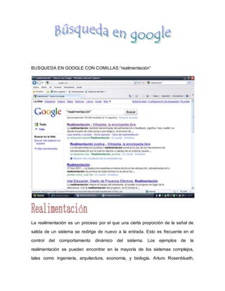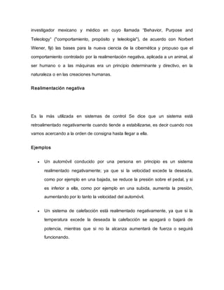 Este documento trata sobre conceptos fundamentales de sistemas. Explica que la realimentación es un proceso por el cual una parte de la señal de salida de un sistema se redirige a la entrada, lo que permite controlar el comportamiento dinámico del sistema. También describe los tipos de realimentación negativa y positiva con ejemplos. Define otros conceptos como caja negra, homeostasis, entropía y neguentropía.
