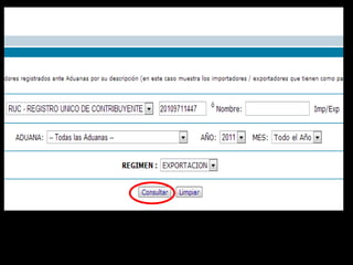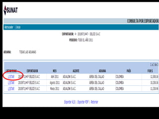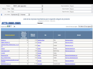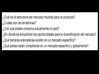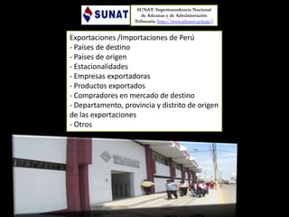 El documento resume varias fuentes de información sobre exportaciones e importaciones de Perú y otros países, incluyendo datos demográficos, productos, países de origen y destino, y tendencias. Proporciona estadísticas sobre el comercio exterior de Perú y el mundo de la Organización Mundial del Comercio, la Comisión de Comercio Internacional de EE. UU., y el Ministerio de Agricultura de Perú.