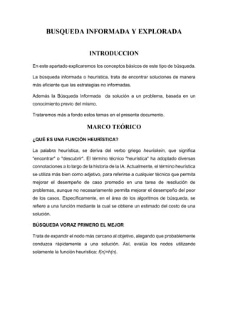 La búsqueda informada o heurística trata de encontrar soluciones de manera más eficiente que las estrategias no informadas mediante el uso de conocimiento previo. El algoritmo A* evalúa los nodos combinando el coste para alcanzar el nodo (g(n)) y el coste estimado de ir al objetivo (h(n)), buscando minimizar f(n)=g(n)+h(n). A* es óptimo si h(n) nunca subestima el coste real, lo que garantiza que f(n) no sobrestime el costo de la soluc