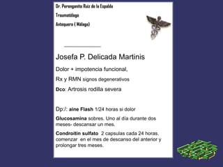 El resumen del traumatólogo indica que la paciente presenta dolor e impotencia funcional en la rodilla, con signos de artrosis degenerativa en las radiografías y resonancia magnética. El tratamiento recomendado incluye antiinflamatorios no esteroideos para el dolor y glucosamina y condroitin sulfato durante varios meses para tratar la artrosis.