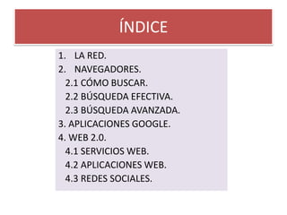 Este documento describe diferentes herramientas y servicios para buscar y gestionar información en Internet. Explica los navegadores más populares, cómo funcionan los buscadores como Google y realizar búsquedas efectivas. También describe las aplicaciones de la Web 2.0 como redes sociales, wikis, blogs, alojamiento de vídeos y mashups. Por último, incluye ejemplos de repositorios para almacenar documentos online.