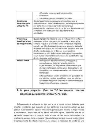 Este documento discute el uso de las tecnologías de la información y la comunicación (TIC) como recursos didácticos en el aula. Señala que las TIC como blogs, proyectores, videos y software pueden motivar e involucrar a los estudiantes. Entre las ventajas se incluyen una mayor interactividad, cooperación y aprendizaje autodirigido. Sin embargo, también pueden causar distracciones e información poco confiable si no se usan correctamente. El documento concluye que los docentes deben estar dispuestos a aprender sobre las