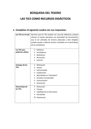 El documento resume las ventajas y desafíos de utilizar las tecnologías de la información y la comunicación (TIC) en el aula. Ofrecen diversidad de herramientas educativas como software, simuladores, aplicaciones y animaciones. Si bien motivan e involucran a los estudiantes, también plantean desafíos como la distracción y la necesidad de capacitar a los docentes en su uso para aprovecharlas al máximo en la enseñanza y el aprendizaje.