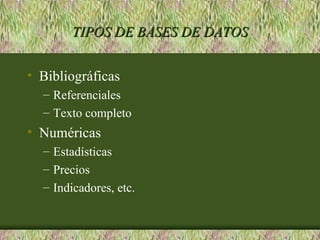 Este documento describe diferentes estrategias para realizar búsquedas en bases de datos y sistemas de información. Explica los tipos de bases de datos, como las bibliográficas y numéricas, y cómo acceder a ellas, ya sea de forma gratuita, restringida o mediante suscripción. También describe los campos y registros de las bases de datos, así como operadores lógicos como AND, OR y NOT para realizar búsquedas más precisas.