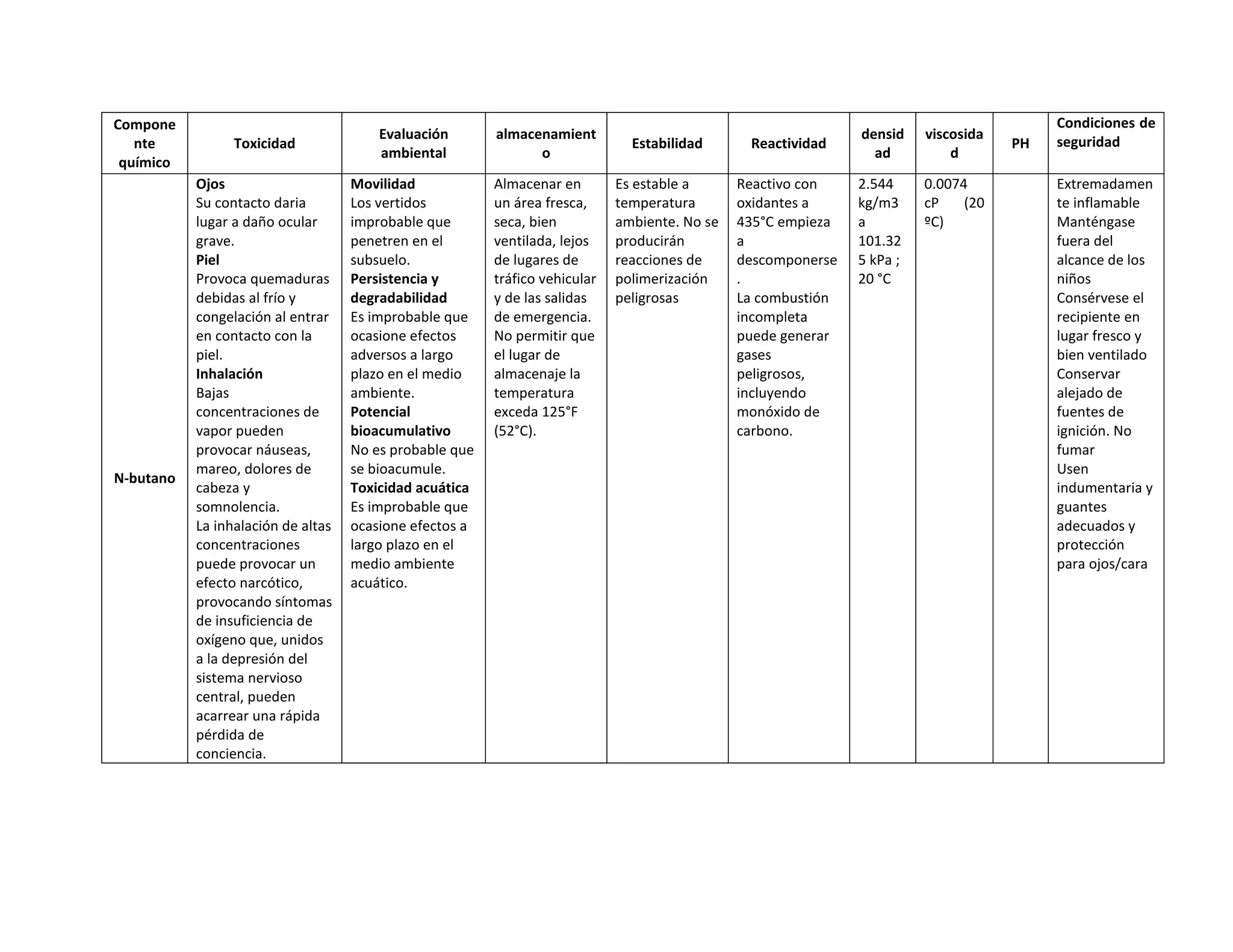 Este documento resume las propiedades y condiciones de seguridad para el N-butano. Es extremadamente inflamable y puede causar quemaduras graves al entrar en contacto con la piel o daño ocular severo. La inhalación de bajas concentraciones puede causar náuseas y mareos, mientras que altas concentraciones pueden causar pérdida de conciencia. Debe almacenarse en un área fresca, seca y bien ventilada, lejos de fuentes de ignición. Es estable a temperatura ambiente y no se descompond