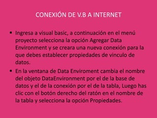 El documento describe los pasos para conectar una aplicación de Visual Basic a una base de datos. Estos incluyen agregar un entorno de datos, establecer propiedades de conexión como el proveedor y la ruta de la base de datos, y probar la conexión. Luego se agrega un comando para seleccionar datos de una tabla y se arrastra al formulario para desarrollar la aplicación.