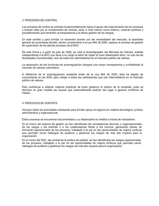 La Bolsa de Valores de Colombia (BVC) se formó en 2001 a través de la integración de las bolsas de Bogotá, Medellín y Occidente. La BVC opera los mercados de acciones, cambios, derivados y renta fija. Tiene su sede principal en Bogotá y oficinas en Medellín y Cali. Desde su creación ha contribuido al desarrollo económico de Colombia facilitando la financiación de empresas a través del mercado de capitales.