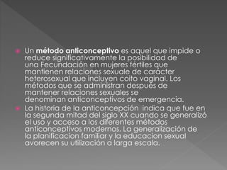 Este documento describe diferentes métodos anticonceptivos, incluyendo métodos hormonales como la píldora y el parche, métodos de barrera como el preservativo y el diafragma, métodos quirúrgicos como la ligadura de trompas y la vasectomía, y dispositivos como el DIU. Explica que la elección del método depende de factores como la frecuencia de las relaciones sexuales, el número de parejas, si se desea tener hijos, la eficacia, los efectos secundarios y el costo. Además, se