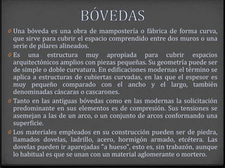 El documento describe los diferentes tipos de bóvedas utilizadas en arquitectura, incluyendo bóvedas de cañón, de arista, vaídas, de crucería y cúpulas. Explica sus características geométricas y los materiales empleados en su construcción a lo largo de la historia, desde la antigüedad hasta la actualidad. También define los principales elementos que componen una bóveda, como los apoyos, puntos de arranque, dovelas y nervios.