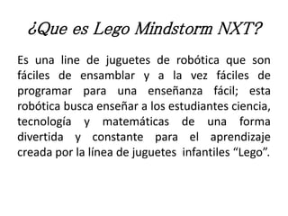 Lego Mindstorms NXT es una línea de juguetes robóticos educativos que son fáciles de ensamblar y programar para enseñar ciencia, tecnología y matemáticas de forma divertida. Consiste en un ladrillo inteligente NXT que controla los sensores táctiles, acústicos, fotosensibles y ultrasónicos, así como los servomotores y lámparas. Se alimenta con baterías recargables y se conecta al ordenador a través de un cable USB para programarlo.