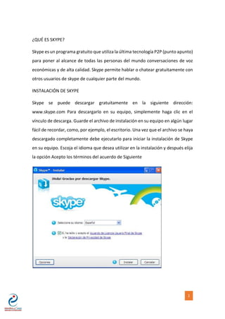 Este documento explica cómo instalar y configurar el programa Skype. Detalla los pasos para descargar e instalar Skype de forma gratuita desde su página web, y explica el proceso de creación de una cuenta de usuario con nombre y contraseña. Una vez instalado, Skype permite realizar llamadas de voz y video gratuitas con otros usuarios en cualquier parte del mundo.