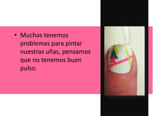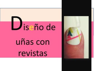 Este documento proporciona instrucciones para decorar las uñas utilizando recortes de revistas. Sugiere preparar las uñas, aplicar dos capas de esmalte de color, y antes de que se seque la segunda capa, colocar imágenes o letras recortadas de revistas sobre las uñas aún húmedas. Luego, aplicar un barniz transparente con cuidado para fijar los recortes y darles brillo, repitiendo la capa si es necesario una vez se haya secado.