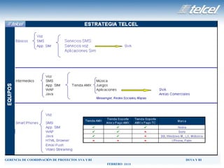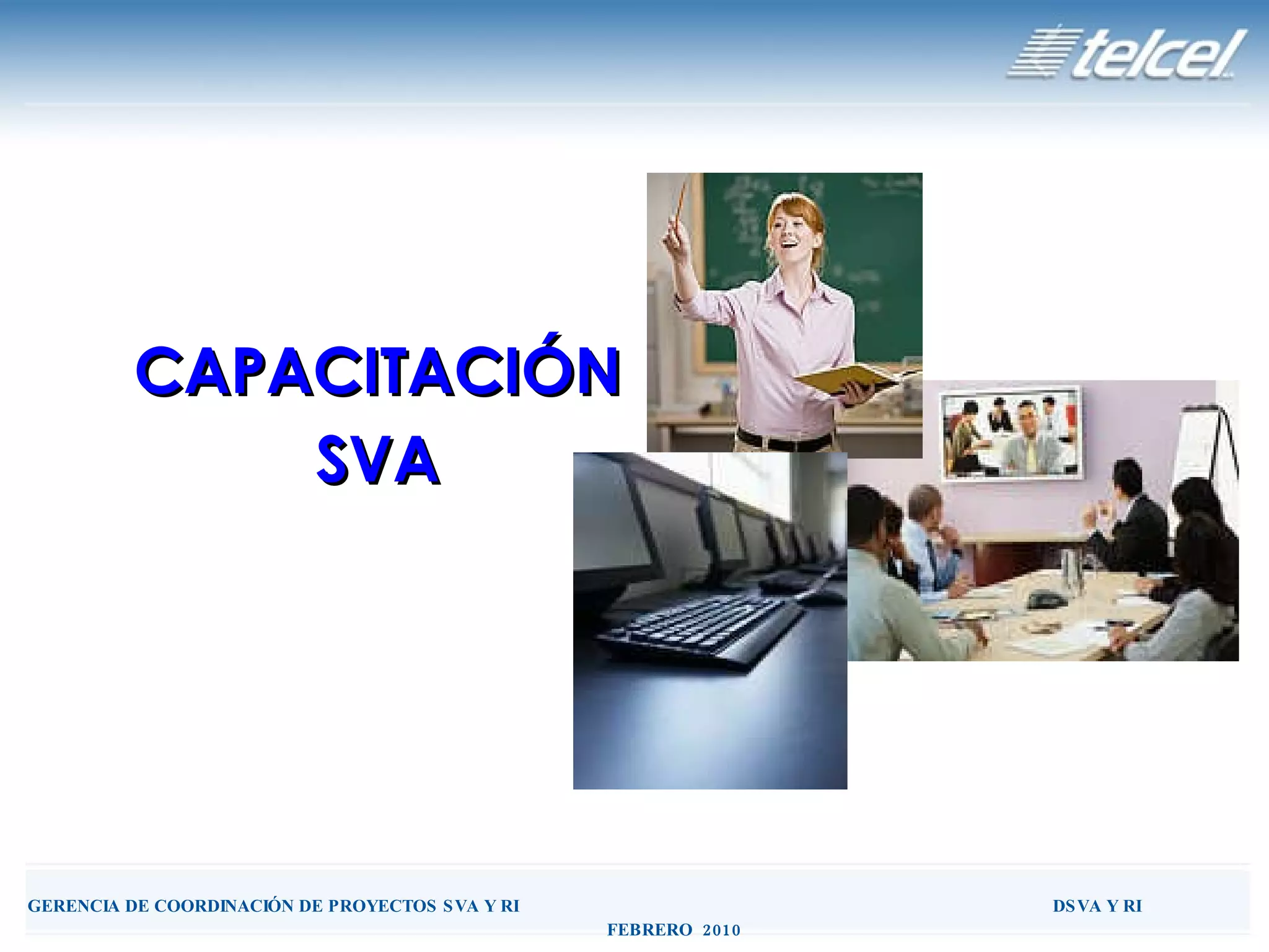 El documento proporciona información sobre la capacitación de Servicios de Valor Agregado (SVA) de Telcel. Detalla los reportes y documentos utilizados para coordinar los cursos, las especificaciones del formato "Nuevo Aviso SVA", y los requisitos de un workshop planeado en 2010. También enumera las herramientas de comunicación utilizadas para difundir información sobre los SVA, e incluye un plan de capacitación para 2010 con el objetivo de capacitar al personal de cada región de Telcel sobre 15 SVA principales.