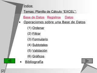 El documento presenta información sobre diferentes temas y operaciones relacionadas con planillas de cálculo en Excel, incluyendo ordenar datos, filtrar datos, usar formularios, agregar subtotales, validar datos ingresados y crear gráficos. Explica los pasos para realizar cada operación de manera concisa a través de ejemplos.