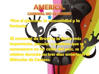 El documento describe diferentes carnavales que se celebran en varias partes del mundo, incluyendo el carnaval de Río de Janeiro en Brasil, el carnaval de Colonia en Europa, el carnaval carioca de Tokio en Asia, el Carnaval de Ciudad del Cabo Minstrel en África y el Carnaval de Australia.
