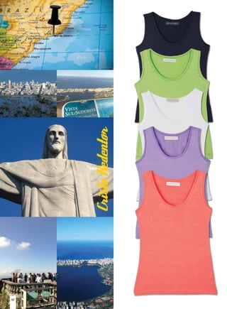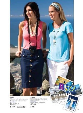 Este documento presenta una variedad de prendas de vestir para mujeres, incluyendo pantalones, remeras, musculosas y polleras de diferentes estilos, talles y colores. Cada prenda describe brevemente los detalles de diseño, materiales y precio.