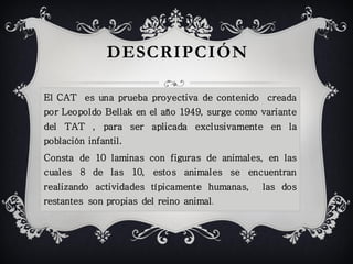 El CAT es una prueba proyectiva creada en 1949 para evaluar niños. Consiste en 10 laminas con figuras de animales realizando actividades humanas. El objetivo es explorar temas como la alimentación, el complejo de Edipo, la rivalidad familiar y los miedos del niño. El examinador pide al niño que cuente una historia para cada lamina describiendo qué pasó antes, qué pasa ahora y qué pasará después. Esto permite evaluar las relaciones del niño con sus padres y sus principales ansiedades y conflictos.